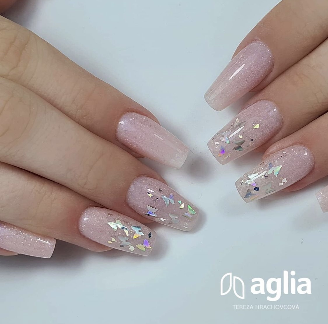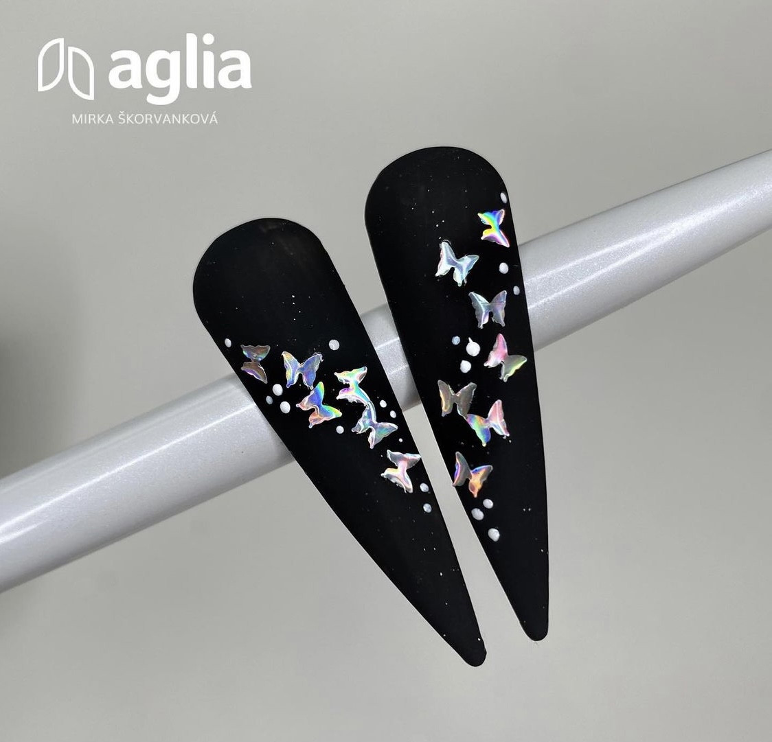 Divatos mini konfetti pillangók formájában, ezüst holografikus hatással, zselé alatti alkalmazására alkalmas.