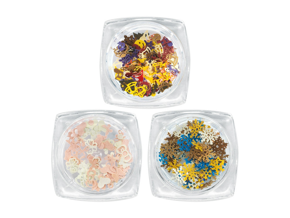 Finom dísztárgyak, amelyek segítségével egyszerűen és gyorsan létrehozhat egy egyedi körömdíszt. Mivel puhák és vékonyak, könnyen felvihetők és szépen tapadnak a felületre. A készlet 3 különböző formát és mintát tartalmaz.